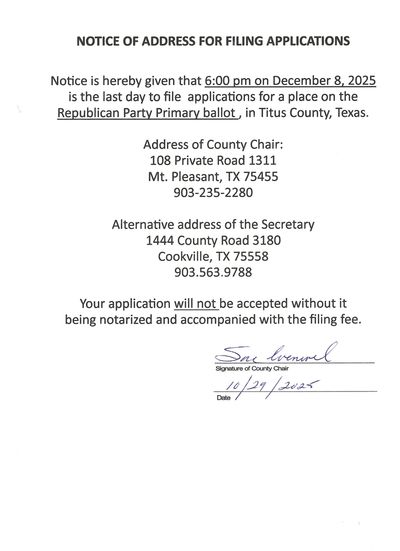 Notice for getting added to the Republican Primary Ballot in Titus County TX.